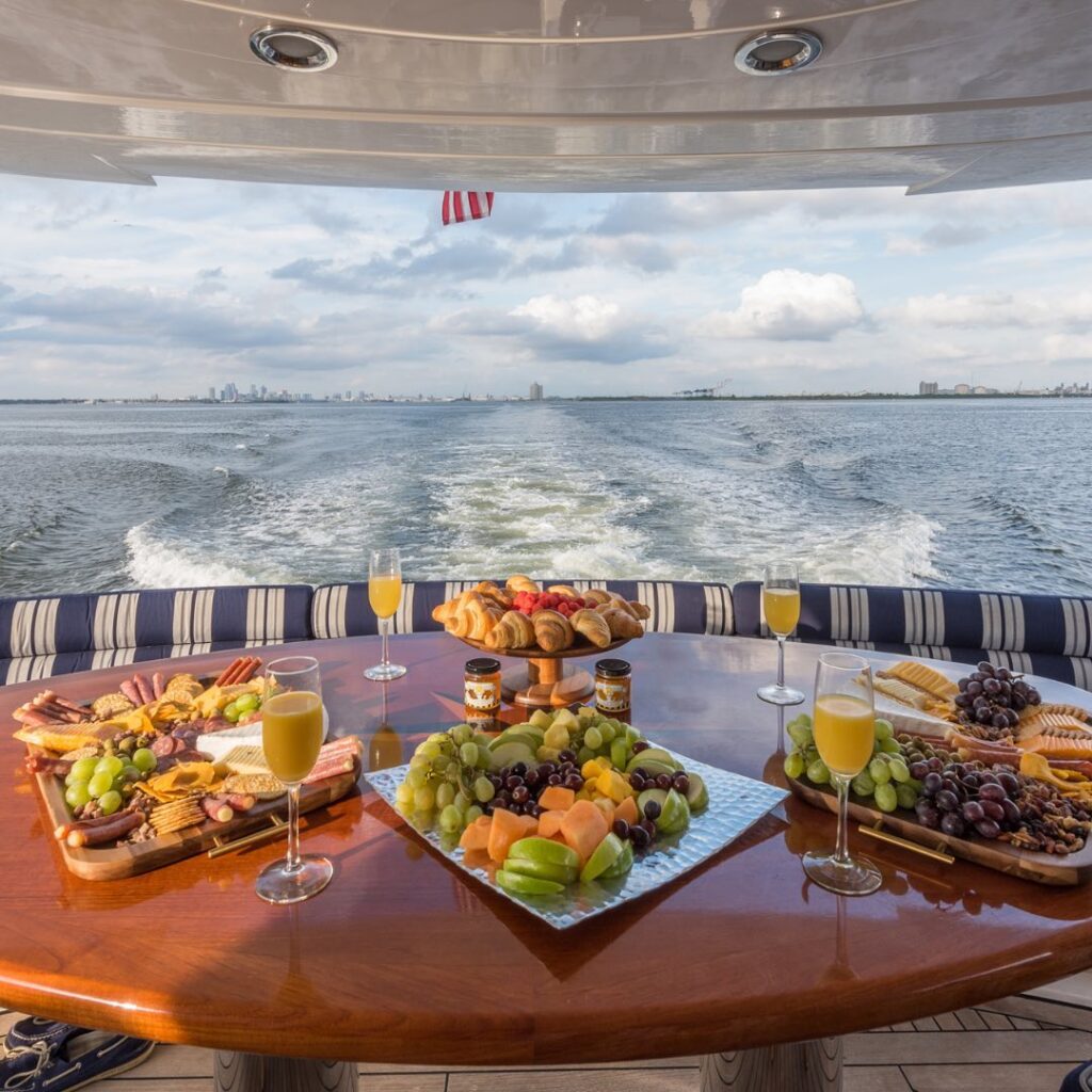 To elevate the experience, consider adding a private chef who will prepare and serve a personalized menu onboard. From coastal-inspired appetizers to gourmet dinner service, your meal becomes a central part of the celebration. For guests who prefer to bring their own menu, our yachts also feature a fully equipped galley and outdoor grill.